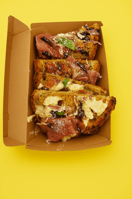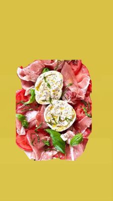 Napoli base, whole burrata, prosciutto, Pesto, herbs, and crusty ciabatta