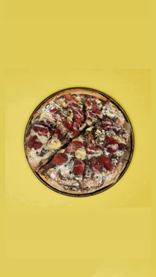 Tomato base, mozzarella, bacon, lamb, pepperoni, pulled pork, BBQ Swirl.