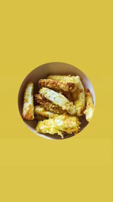 Sticks of grilled halloumi coated in herbs & citrus oil.