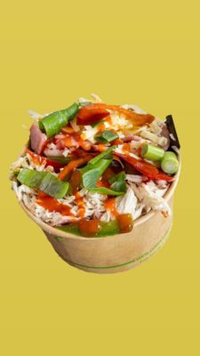 Garlic base, popcorn honey chicken, onion, jalapeños, spring onion, and hot honey swirl