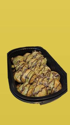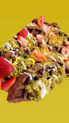 Mini pancakes coated in pistacio cream, white and milk chox and icing sugar