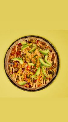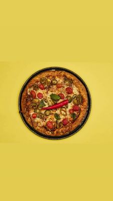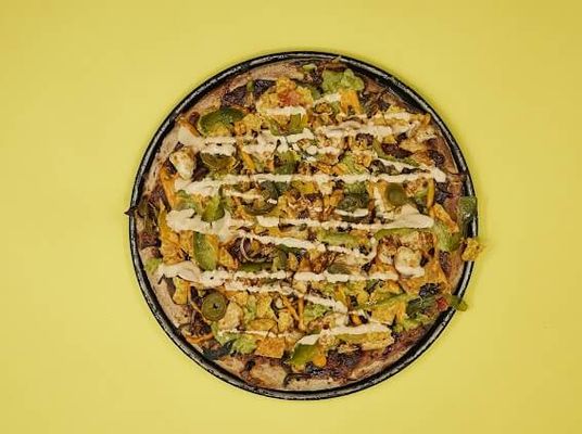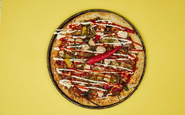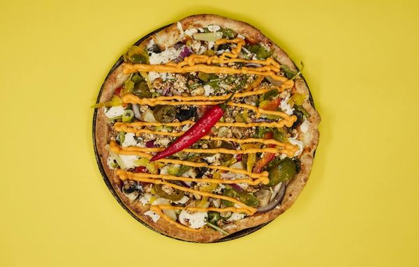 Spicy tomato base, vegan cheese, spinach, capsicum, onion, cherry tomatoes, jalapeños, rocket, and vegan aioli