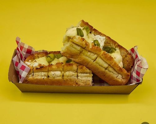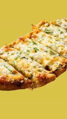 Garlic bread stuffed with three cheese & topped with spring onion.