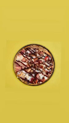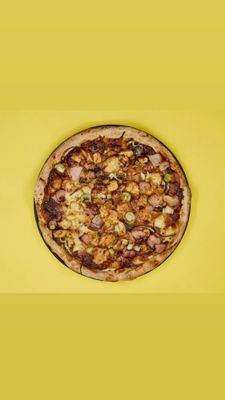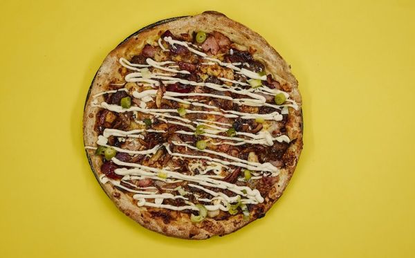 BBQ base, sausage, pepperoni, beef, chicken, bacon, mozzarella, spring onion, and kewpi swirl