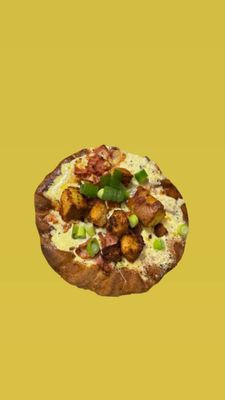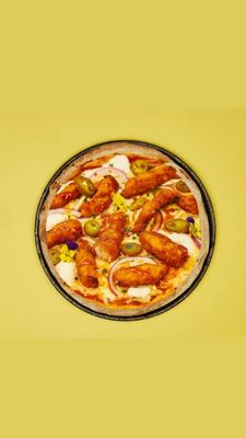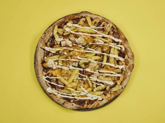 Tomato base, mozzarella, fried chicken, bacon, fries, and aioli swirl and spring onion