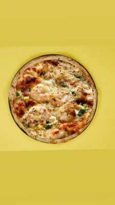 Garlic base, prawns, cherry tomatoes, chilli, capsicum, mozzarella, pesto swirl, and herbs