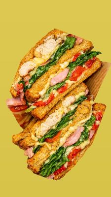 A classic Club layered sandwich, on choice of bread filled with, chicken, bacon, lettuce, cheese, tomato & aioli